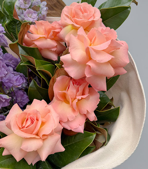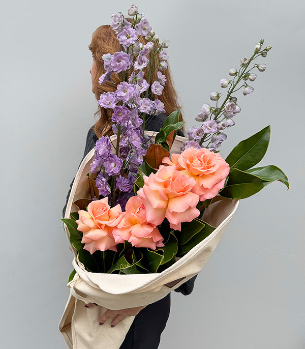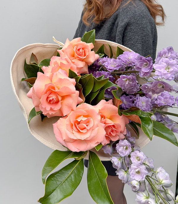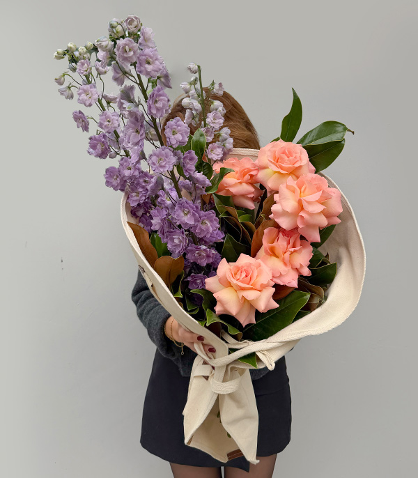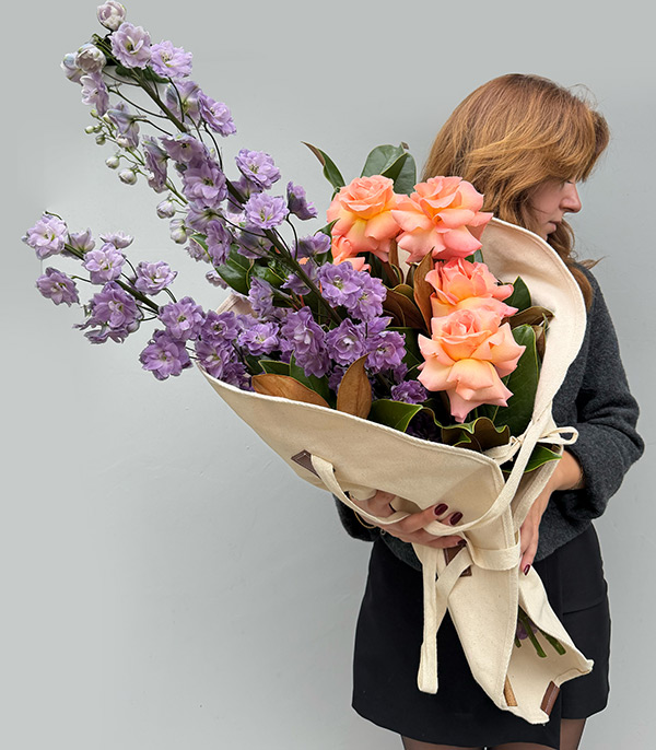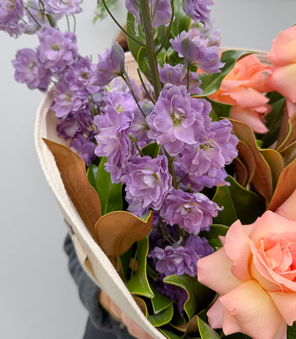 Buketimizin içerisinde, ekvator gülleri, lila ithal delfinyumlar ve manolya yaprakları bulunmaktadır.