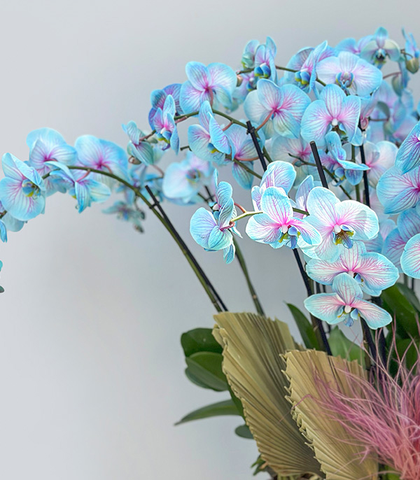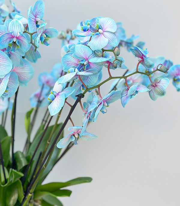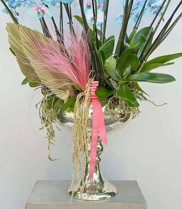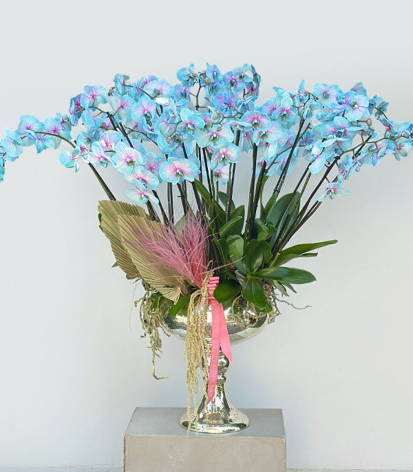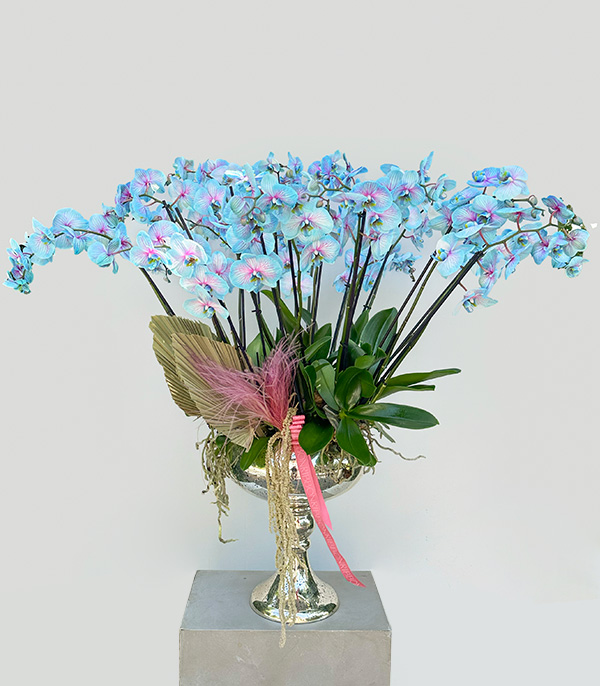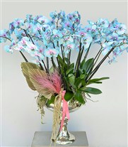 Eskitme görünümlü grand silver renkli cam saksıda; özel 20 Dallı Mavi Pembe Orkide Bubble Gum